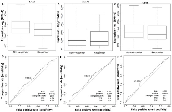 Diagnostic receiver operating characteristic (ROC) curves of the KRAS/MMP7/CD44 oncogenes distinguishing colorectal adenocarcinoma (COAD) responding and non-responding patients. (A–C) Boxplot center lines showing expressions of the KRAS/MMP7/CD44 genes in a COAD cohort from an ROC analysis revealing the influence on the responses of these genes to treatment by lowering the response rate. (D–F) ROC curves based on true and false positive rates. The area under the curve (AUC) scores of KRAS, MMP7, and CD44 were 0.557, 0.537, and 0.551, respectively, with p < 0.05 considered significant. This suggests that KRAS, MMP7, and CD44 can potentially serve as diagnostic biomarkers in colorectal cancer.