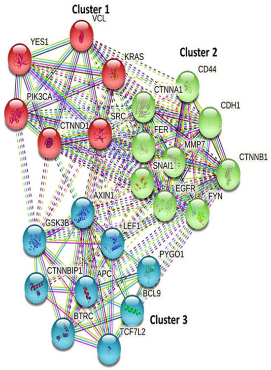 The PPI network analysis among KRAS/MMP7/CD44 gene signatures, using the STRING database under high confidence revealed interactions among the genes as indications of correlations based on experimental data (pink), gene neighborhoods (green), gene fusion (red), gene co-occurrences (blue), and gene co-expressions (black), e.g., KRAS with CTNNB1, KRAS with CD44, CDH1 with CD44, MMP7 with CD44, MMP7 with KRAS, and CTNNB1 with MMP7. The network had an initial four proteins, which were further increased to 24 nodes. Moreover, the network interactions showed that the genes were arranged in three different clusters: cluster 1 (red) included KRAS, PIK3CA, and YES1; cluster 2 (green) included MMP7, CD44, CTNNB1, and EGFR; and cluster 3 (blue) included GSK3B, APC, and CTNNB1. Protein enrichment of p < 1.0 × 10−16 was obtained from the clustering analysis, with a coefficient of 0.772. Table 1 is a summary of all the genes which interacted with the KRAS, MMP7, and CD44 oncogenes with the confidence cutoff value set to 0.900 (Figure 6, Table 1).