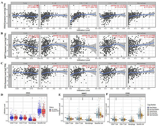 To identify associations of KRAS/MMP7/CD44 expressions with selected immune cells, we applied a correlation analysis between the above-mentioned oncogenes and immune infiltration cells (B cells, CD8+ T cells, CD4+ cells and macrophages), where markers were adjusted by purity. As anticipated, results showed correlations of immune cell markers in colorectal adenocarcinoma (COAD), specifically B cells, CD8+ T cells, CD4+ cells and M2 macrophages (Figure 8A–C), with p < 0.05 considered significant. Expressions of KRAS/MMP7/CD44 were also found to be correlated with infiltrating levels of CD8+ T cells, CD8+ T cells, macrophages, and DCs (Figure 8D–F).