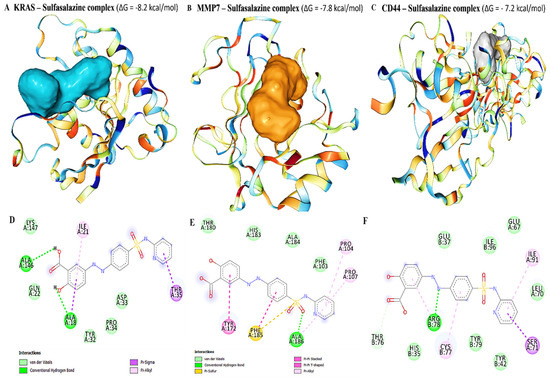 Sulfasalazine in complex with KRAS, MMP7, and CD44 displayed putative binding interactions. (A–C) Binding interactions of KRAS, MMP7, and CD44, with sulfasalazine exhibited binding affinities of −8.2, −7.9, and −7.2 kcal/mol, respectively. Moreover, the visualization analysis revealed interactions by conventional hydrogen bonds (H-bonds) with ALA145 and ALA18 for KRAS, ALA186 for MMP7, and ARG78 for CD44. Interactions were further stabilized by van der Waals forces, π–π stacking interactions, and carbon-hydrogen bonds in the binding pockets of the receptors (D–F).