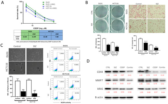 We investigated the inhibitory effects and therapeutic efficacy of Sulfasalazine (SSZ), against CRC cell lines. Using the SRB colorimetric assay, we showed SSZ treatment sensitized CRC cells towards cisplatin (CDDP) treatment (Figure 11A). Moreover, we tested the effects of SSZ on the biological properties of CRC cells and showed that SSZ treatment significantly reduced the clonogenicity, migration (Figure 11B) and tumorsphere-formation in both DLD-1 and HCT116 cells. ALDH is a cancer stemness marker, which is also shown to promote metastasis and treatment resistance [58], herein, we showed that compared to control or vehicle-treated cells, SSZ (50 μM, 48 h) suppressed ALDH activity in the DLD-1 cells by 11.64%, while in the HCT116 cells, it displayed a 5.5% reduction (Figure 11C). Mechanistically, western blot results supported our bioinformatics analysis as the expression of KRAS, MMP7, and CD44 expression levels were reduced by SSZ alone and more prominently when combined with CDDP (Figure 11D).