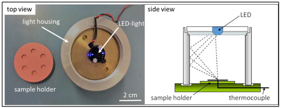 The in-house developed set-up used for curing experiments of resins without and with bioactive glass fillers. The top view (left side) is a photographic image of the sample holder (made from silicone) and the light source (LED) for curing tests. The side view (right side) gives a schematic of the equipment. The sample holder is located in the middle bottom, while light is emitted from the LED at the top of the set-up.
