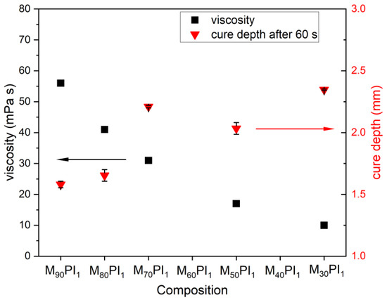 Influence of monomer content (ratio of TMPE-OTA and HEA) on resin properties. The left-side y-axis shows viscosity values (black squares ■, at shear rate 200 s−1) and the right-side y-axis shows the achieved curing depth after 60 s of light exposure (red triangles ▼) (error bars show the mean variation).