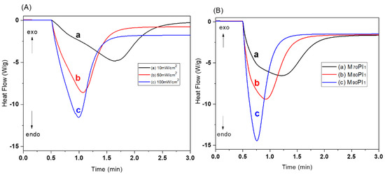 Photo-Differential Scanning Calorimetry (DSC) under exposure to UV light in the range between 250 and 600 nm at 10, 50 and 100 mW/s was conducted to measure heat flow during curing. The measurements were performed by using a DSC Q2000 (TA Instruments, Milford, MA, USA) calorimeter.