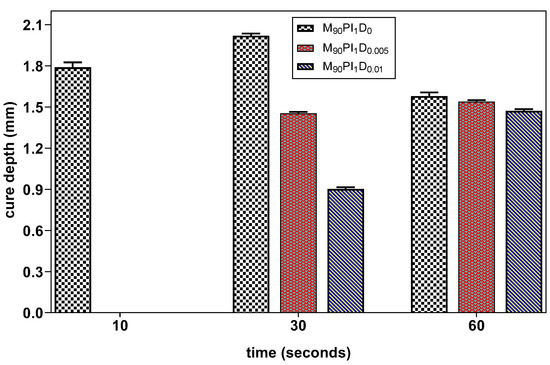 Dye in photocurable resins is used to absorb photons (without creating free radicals) and suppress the light scattering that may occur due to deflection by filler particles over the slurry layers, which helps to control the overgrowth [23]. Therefore, the influence of the dye content on the photocuring behavior of the resin was investigated for a more reactive acrylate composition M90PI1. Figure 4 shows that the dye content has an influence on the cure depth of the resin at 10 and 30 s exposure time. In M90PI1D0, curing took place after 10 s exposure, while both M90PI1D0.005 and M90PI1D0.01 remained in gel form at this exposure time. On increasing the exposure time to 30 s, the cure depth of M90PI1D0, M90PI1D0.005 and M90PI1D0.01 was 2.02, 1.45 and 0.45 mm, respectively. Hence, samples with more dye content showed less curing depth. When the exposure time increases to 60 s, curing volume shrinkage was observed in the M90PI1D0 (sample without dye). For both M90PI1D0.005 and M90PI1D0.01 samples with different dye contents, the curing depth value increases at 60 s exposure time because the available free radicals which may cause volume shrinkage are readily absorbed by dye.