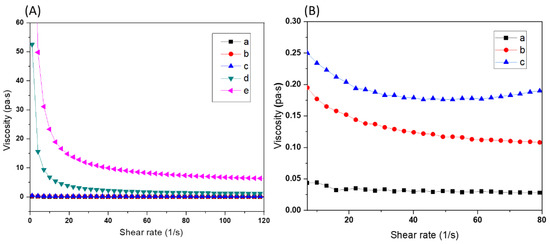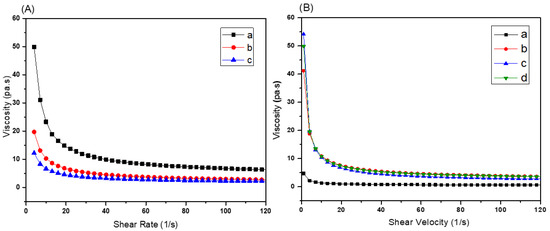 (A) Influence of PEG-200 on viscosity (a) 60BM90PI1D0.005E0, (b) 60BM90PI1D0.005E10 and (c) 60BM90PI1D0.005E15. (B) Influence of bioactive glass content on the viscosity of the resin (a) 45BM90PI1D0.005E10, (b) 55BM90PI1D0.005E10, (c) 60BM90PI1D0.005E10 and (d) 65BM90PI1D0.005E10.