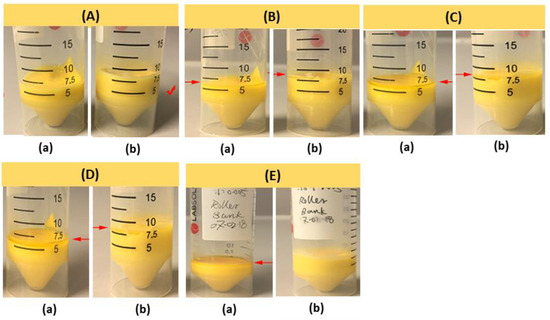 Photographic images showing the shelf life of resin 55BM80PI1D0.005 with 55% bioactive glass determined at room temperature for different time periods; (A) day 1, (B) day 2, (C) day 6, (D) day 10 and (E) day 43. The falcon tubes (a) are without PEG-200 (55BM80PI1D0.005E0), while faclcon tubes (b) contains 10% PEG-200 (55BM80PI1D0.005E10).