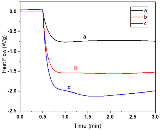 Influence of BAG contents on the heat flow (indicator of photopolymerization) of resin xBM80PI1D0.01E10 irradiated with 50 mW/cm² (a) 60BM80PI1D0.01E10 with 60% BAG, (b) 55BM80PI1D0.01E10 with 55% BAG and (c) 40BM80PI1D0.01E10 with 40% BAG.