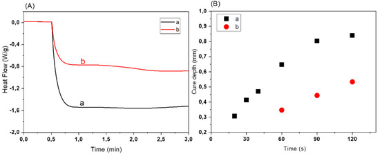 (A) Influence of dye on heat flow (indicator for photopolymerization) for resin 50BM90PI1Dd with 50% m/mresin bioactive glass contents (a) 50BM90PI1D0 without dye and (b) 50BM90PI1D0.01 with 0.01% dye. (B) Influence of dye contents on cure depth of the resin (a) 50BM90PI1D0.005 (black square ■) with 0.005% dye and (b) 50BM90PI1D0.01 (red circle ●) with 0.01% dye.