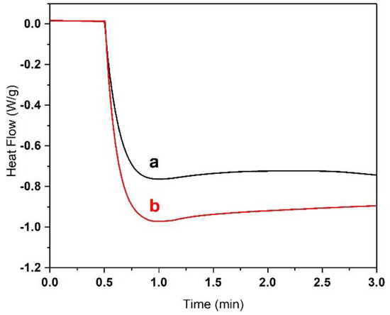 The influence of concentration of photo-initiator on heat flow (indicator of photopolymerization) in the resin, (a) 55BM80PI1D0.01E10 with 1% (m/macr) PI and (b) 55BM80PI2D0.01E10 with 2% (m/macr) PI.