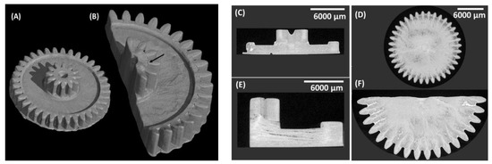 µ-CT images of the gear-shaped objects fabricated from 55BM80PI1D0.015E10 (A,C,D) and 60BM80PI1D0.015E10 (B,E,F) resins. (C,E) are side views of (D,F).