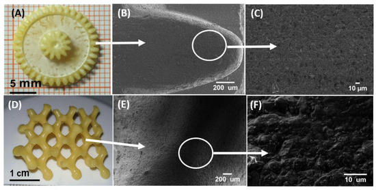 The photographic images of 3D printed small gear-shaped (A) and honey-comb (D) samples with composition 55BM80PI1D0.015E10. (B,C,E,F) SEM images of these 3D printed samples.