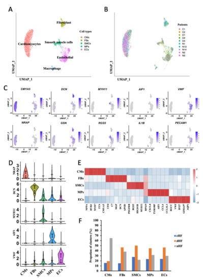 Five cell types were identified from single-cell transcriptome of heart disease. (A,B) Uniform Manifold Approximation and Projection (UMAP) plots. Clusters are color-coded by cell types (A) and patient (B). (C) Canonical markers for 5 different cell clusters on the UMAP plot. (D) Violin plots of canonical marker of 5 cell types. (E) Heatmap depicting the top 5 differentially expressed genes (DEGs) in each cell cluster. Rows indicate cell types and columns indicate genes. (F) Cell proportion of 3 sample sources in each cell type.