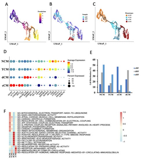Cardiomyocytes (CMs) cluster into 4 distinct phenotypes. (A–C) Cell trajectory of CM calculated by Monocle3, cells were colored by pseudotime (A), sample (B), and phenotypes (C). (D) Dot plot of CM subpopulations demonstrates the top five markers of each type. Dot size corresponds to proportion of cells expressing each transcript within the group, and dot color stands for scaled expression level. (E) The distribution of three kinds of samples (nHF, cHF, dHF) in four CM phenotypes (NCM, ECM, cCM, dCM). (F) Differences of pathway enrichment among 4 CM phenotypes.