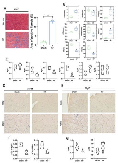 Abnormal expression of myosin subunits was supported in the rat heart failure models. (A) Masson staining of the HF and sham group (Left). Histogram of the area of positive fibrosis (Right). n = 5 per group. * p < 0.05 vs. sham. (B) Left ventricular systolic function parameters images at the study endpoint between the HF and sham group. n = 5 per group. * p < 0.05 vs. sham. LVIDd: Left ventricular diastolic inner diameter; LVEF: Left ventricular ejection fraction; LVIDs: Left ventricular systolic inner diameter; FS: Fraction shortener; EF: Ejection Fraction; LVPWd: left ventricular diastolic posterior wall thickness; LVPWs: Left ventricular systolic posterior wall thickness. (C) mRNA expression of MHC and MLC subunits. n = 8 per group. * p < 0.05 vs. sham; ns: no significance. (D,E) Representative immunohistochemistry images of the hearts of the sham and HF group indicate the myosin subunits change, including Myl7, Myh6. (F) AOD of Myh6 or Myl7 immunohistochemistry images. n = 5 per group. * p < 0.05 vs. sham. (G) mRNA expression of transcription factors TBX5 and ATF6, n = 8 per group. * p < 0.05 vs. sham.