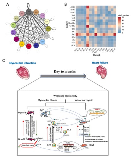 Intracardiac regulatory network-mediated microenvironmental changes in HF. (A) Receptor–ligand pairs between cell populations. Each point represented one cell group; the size of the point indicated the number of receptor-ligand pairs associated with it. Lines represented the pairs between two groups, the thicker the line is, the more pairs exist. (B) Heatmap shows the number of interactions between two cell clusters (C) Network of potential mechanisms from myocardial infarction to heart failure.