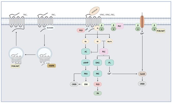 VIP and PACAP receptor-mediated signalling pathways. PAC1 and VPAC receptors are preferentially coupled to Gαs, leading to activation of adenylate cyclase (AC), subsequent cAMP production, and activation of protein kinase A (PKA). PKA may in turn activate extracellular signal-regulated kinases (ERKs). These three class B receptors can also activate the phospholipase C (PLC) pathway after coupling to Gαi, Gαq, or Gα16 and stimulate calcium levels and protein kinase C (PKC). Released Gβγ can activate PLC and phosphoinositide 3-kinase (PI3K/Akt) pathways, and Ca2+ entry into the cell through receptor-operated Ca2+ ion channels. PAC1 and VPAC receptors may also activate phospholipase D (PLD) through the ADP-ribosylation factor- (ARF) or a PKC-dependent mechanism. cAMP response element-binding protein (CREB) signalling was also demonstrated following activation by kinases acting downstream of PAC1 and VPAC receptors, such as PKA, CamK (Ca²⁺/calmodulin-dependent protein kinase), and ERK. Internalized receptors may also activate G protein-independent signalling pathways, as seen for PAC1 and activation of MAPK through a β-arrestins-dependent mechanism and for PI3K/Akt.