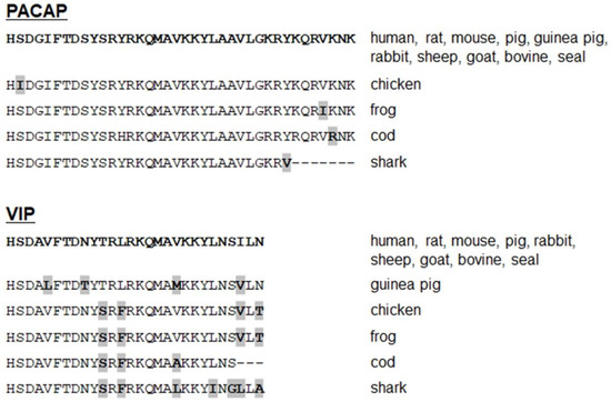 Comparison of PACAP and VIP amino acid sequences from various vertebrate species. Amino acids that differ from human sequences are in bold and highlighted, and those which are missing are indicated with dashes.