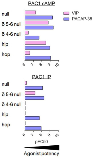 Agonist potency for PAC1 splice variants. Summary of VIP (pink) and PACAP-38 (dark blue) potency, evaluated by pEC50 values (-logEC50 (M)) for stimulation of AC/cAMP and PLC/IP pathways on cells stably transfected with human PAC1 null or selected splice variants. Data collected from [81,82,92,93,95,96].