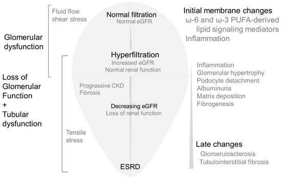 Hyperfiltration and renal fibrosis are temporally distinct events in the development and progression of CKD. Cellular stress caused by hyperfiltration induces changes in the plasma membrane, leading to signaling for mechanotransduction. These early events initiate increasingly complex responses that lead to fibrogenesis and end-stage renal disease (ESRD). Early events also trigger the synthesis of matrix proteins that begin to accumulate in the absence of matched degradation by metalloproteases. Continued matrix accumulation triggers uncontrolled and irreversible pathophysiological changes [,,,].