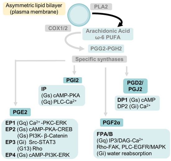 PGE2 is the most abundant prostanoid under physiological conditions and the subject of many studies. PGE2 is synthesized from endoperoxide (PGH2) by Prostaglandin E2 synthase (PGES, 3 isoforms) []. PGE2 is a ligand of four E-prostanoid (EP1–4) receptors [,] expressed in a cell/nephron segment-specific manner. Each G-protein-coupled receptor activates the signaling pathway indicated (Figure 2).