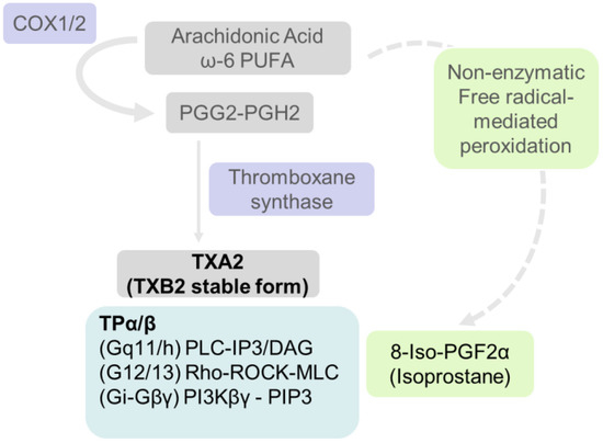 Thromboxane A2 (TXA2) synthesis is catalyzed by thromboxane A2 synthase (TXA2S) from prostaglandin endoperoxide (PGH2) generated by COX activity on free arachidonic acid (summarized in Figure 3). TXA2 is detected in its stable form TXB2. TXA2 activates thromboxane receptors (TPα and TPβ) that are G (Gq and Gs)-protein-coupled receptors expressed in podocytes [,]. TXA2 signaling results in phospholipase C activation and RhoGEF activation, causing PI3K-mediated calcium release, cAMP generation and cytoskeletal changes []. TXA2 is a pro-inflammatory vasoconstrictor and facilitator of platelet aggregation. It regulates renal hemodynamics and water and electrolyte metabolism and plays a role in the pathophysiology of renal diseases including diabetic nephropathy. A balance between the levels of TXA2 and PGI2 is considered essential for renal homeostasis and regulation of platelet aggregation.