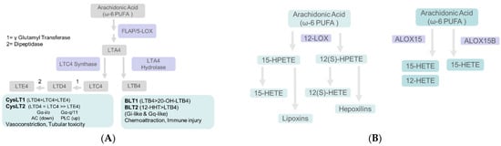 Arachidonic acid oxidation catalyzed by 5-lipoxygenase (5-LOX) initiates reactions leading to four stable leukotrienes (LT), namely LTB4 and three cysteine-containing LTC4, LTD4 and LTE4. Leukotrienes bind to and activate G(Gq/Gi) protein-coupled receptors (Figure 4A). Montelukast, an antagonist of the leukotriene receptor, was shown to block the IL-13-induced internalization and downregulation of ZO-1 protein in podocytes []. Gq-dependent signaling in podocytes was found to upregulate COX2 expression and PGE2 production []. Arachidonic acid is also utilized by (i) 12-LOX to generate 12/15-hydroxyeicosatetraenoic acids and lipoxins (a specialized pro-resolving mediator) and by (ii) 15-LOX to generate 15/12-HETE (Figure 4B).