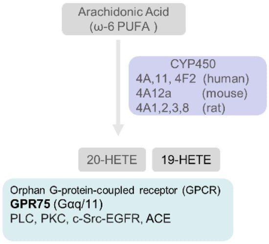 20-HETE is the primary product of CYP450A and CYP4F activities. 20-HETE uses a recently identified GPR-75, a G (Gαq/11)-protein-coupled receptor that activates inositol phosphate production. GPR75 interaction with GPCR kinase-1 leads to c-Src-mediated activation of EGFR, upregulation of angiotensin-converting enzyme (ACE) and endothelial dysfunction []. 20-HETE can be metabolized by cyclooxygenase to form 20-OH-PGE2 that promotes lipid accumulation in mesenchymal stem cell-derived adipocytes resulting in upregulation of adipogenic regulators PPARγ and β-catenin [,].