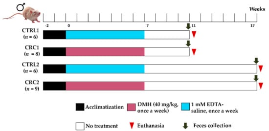 The control groups (CTRL1 and CTRL2) were injected with EDTA–saline solutions, and the CRC groups (CRC1 and CRC2) were injected with DMH. Groups 1 and 2 were euthanized 11 and 17 weeks after the first administration, respectively.