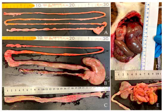 Macroscopic appearance of small and large intestines. (A) Intestine without lesions (CTRL1 group). (B) Hemorrhagic distension of small intestine and cecum (CRC2 group). (C) Colon + rectum with inflammation in the intestinal lumen (CRC2 group). (D) Dilated cecum showing a focal necrotic lesion before opening (CRC2 group). (E) Mesenteric lymph node enlargement (arrow), and small intestine and cecum distension (CRC2 group).