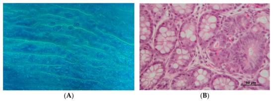 Colon analysis. (A) Presence of aberrant crypt foci (ACF) in the colon of CRC2 group (methylene blue staining, stereomicroscope); (B) Colon with the presence of focal mild epithelial dysplasia, CRC1 group (HE staining).