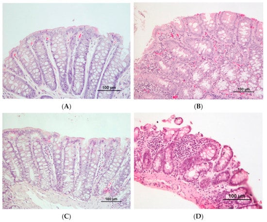 After fixation, collected organs were processed for routine histopathological analysis. Formalin-fixed intestinal samples from both groups CRC were previously stained with 0.2% methylene blue for 5 min for preneoplastic aberrant crypt foci (ACF) screening and quantification under a stereomicroscope (Leica Zoom 2000, Wetzlar, Germany) []. A 4-μm section of paraffin-embedded of each sample was stained with hematoxylin and eosin (H&E) and observed blindly under a light microscope by a veterinary pathologist, considering the criteria proposed by Nolte et al. []. The degree of inflammation of small intestine and cecum was evaluated on a scale from 0 to 3 (0 = no inflammation, 1 = mild, 2 = moderate, and 3 = severe). The degree of inflammation of the colon was evaluated according to Tian et al. []. Briefly, the severity of inflammation was assessed on a scale from 0 to 3 (0 = no inflammation, 1 = mild, 2 = moderate, and 3 = severe) and the thickness of inflammatory involvement was scored from 0 to 3 (0 = no inflammation, 1 = mucosa, 2 = mucosa plus submucosa, and 3 = transmural). Furthermore, the severity of epithelial damage was scored from 0 to 3 (0 = intact epithelium, 1 = disruption of architectural structure, 2 = erosion, and 3 = ulceration) and extent of lesions was also scored from 0 to 3 (0 = no lesions, 1 = punctuate, 2 = multifocal, and 3 = diffuse).