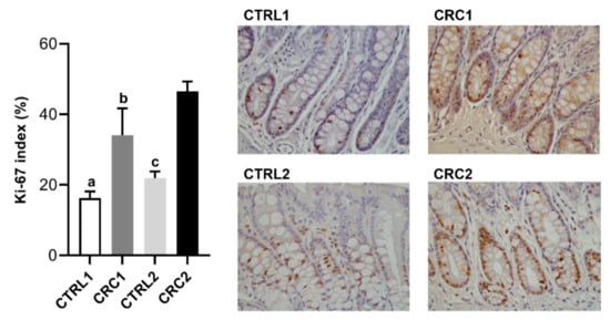 Regarding the expression of the cell proliferation marker Ki-67 in intestine sections, CRC1 and CRC2 groups had a significantly higher Ki-67 immunolabelling when compared with control groups (p < 0.001, Figure 5).