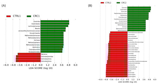 Linear discriminant analysis (LDA) effect size (LEfSe) of gut microbiota showing significant differences in the fecal microbiota of control (CTRL) and DHMH-induced colorectal cancer (CRC) rats. (A) Rats at 20 weeks of age and (B) rats at 26 weeks of age. Red bars, CTRL groups; Green bars, CRC groups.