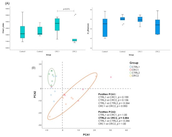 Linear Discriminant Analysis (LDA) Effect Size (LEfSe) was carried out using the online interface Galaxy http://huttenhower.sph.harvard.edu/galaxy/root accessed on 11 December 2020 to determine specific differences in relative abundances in microbial taxa between two groups (CTRL1 vs. CRC1, CTRL2 vs. CRC2, etc.). Principal component analysis (PCA) was performed with SPSS software v.26.0 (SPSS. Inc, Chicago, IL, USA) using discriminant microbial groups (phylum, family, and genus) obtained in the LEfSe analysis. ANOVA followed by Dunnett T3 post hoc was used to find differences in principal components (PCA1 and PCA2) between groups (CTRL and CRC).