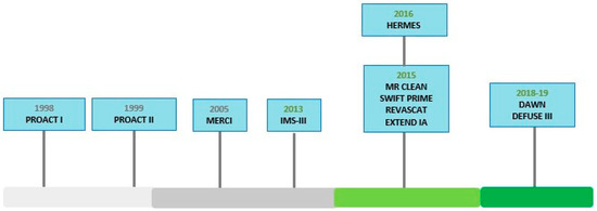 Among the recent achievements in acute stroke therapies, EVT is one of the most celebrated accomplishments. The first significant attempt to achieve mechanical recanalization was made using pro urokinase. Del Zoppo, Furlan, and others designed the Prolyse in Acute Cerebral Thromboembolism (PROACT,1 and 2) trials to demonstrate the safety, recanalization efficacy, and clinical benefit of IA r-pro-UK in patients with middle cerebral artery (MCA) occlusion, treated within 6 h of stroke onset [10,11].