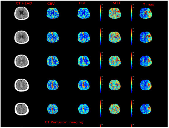 CT Perfusion imaging in patient presenting with left middle cerebral artery occlusion, cerebral blood volume (CBV) is preserved, whereas cerebral blood flow (CBF) is decreased, and mean transit time (MTT) is increased.