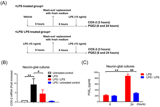 Reduction in COX-2 and PGE2 expression in neuron–glial cultures in response to endotoxin tolerance. (A) Experimental procedure for the study of PGE2 production in endotoxin tolerance. Neuron–glial (NG) cultures prepared from E14.5 time-pregnant C56/6J mice were pre-treated with vehicle (LPS-treated group) or LPS (15 ng/mL) (LPS/LPS-treated group) for 6 h. These pre-treated NG cultures were replaced with fresh media. Six hours later, LPS (15 ng/mL) was added to these NG cells. The level of COX-2 gene expression and supernatant PGE2 production was measured at 3, 6, and 24 h after LPS treatment. (B) After 3 h, the mRNA level of the COX-2 gene was measured in these NG cultures with untreated control, LPS-treated group (LPS), LPS/LPS-treated group (LPS/LPS), and LPS-untreated control group by RT-PCR. Three independent experiments were performed in duplicate. Data are expressed as a percentage of the LPS group (mean ± SEM). ** p < 0.01 vs. untreated control; # p < 0.05 vs. LPS. (C) A supernatant level of PGE2 in these cells with LPS-treated (LPS) and LPS/LPS-treated group (LPS/LPS) was detected at 6 and 24 h after LPS treatment by ELISA. Data are expressed as the mean ± SEM from three independent experiments in duplicate, ** p < 0.01 vs. 6H, ## p < 0.01 vs. LPS.