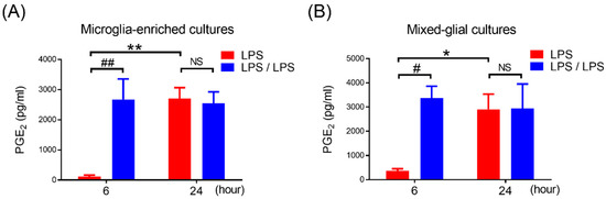 Failure of PGE2 reduction in microglia-enriched and mixed glia cells with endotoxin tolerance challenge. (A,B) A supernatant level of PGE2 in microglia-enriched cultures (A) and mixed glia cultures (MG) containing 80% astroglia and 20% microglia (B) in LPS-treated and LPS/LPS-treated regimen were detected at 6 and 24 h after treatment by ELISA. Five independent experiments were performed in duplicate. Data are expressed as the mean ± SEM, * p < 0.05, ** p < 0.01 vs. 6H; # p < 0.05, ## p < 0.01 vs. LPS. NS: no significant differences.