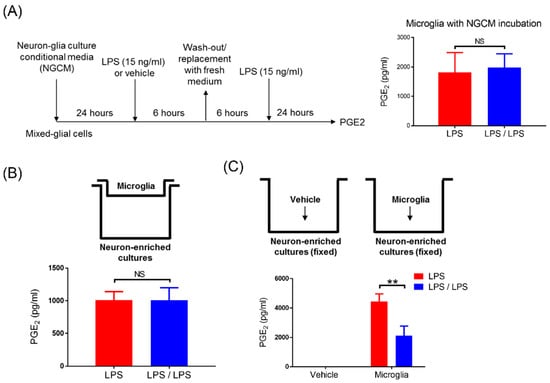 Neural contacts reversed the failure of PGE2 tolerance in microglia. (A) After 24 h incubation with neuron–glial condition media (NGCM), mixed glia (MG) cultures were subjected to the LPS-treated and LPS/LPS-treated regimen, as indicated in the right panel. PGE2 production in the supernatant of these treated MG cells after 24 h of treatment was measured by ELISA. Data are expressed as the mean ± SEM from three independent experiments in duplicate. NS: no significant differences. (B) Microglia were added into Transwell inserts while neurons grew confluent in the lower compartment of the 24-well plate, as indicated in the upper panel. After 24 h of incubation, these cells were applied to the LPS-treated and LPS/LPS-treated regimen. A supernatant level of PGE2 in these treated cells was detected by ELISA at 24 h of treatment. Data are expressed as the mean ± SEM from three independent experiments in duplicate. NS: no significant differences. (C) As indicated in the upper panels, the fixed neuron-enriched cultures were prepared and added with or without microglia. After 24 h of incubation, microglia were applied to the LPS-treated and LPS/LPS-treated regimen. A supernatant level of PGE2 in these treated microglia was measured by ELISA 24 h after treatment. Three independent experiments were performed in duplicate. Data are expressed as the mean ± SEM, LPS group versus the LPS/LPS group. ** p < 0.01. NS: not significant -.