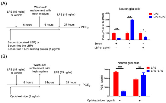 TLR4 signal and de novo protein synthesis is required for the development of PGE2 tolerance in neuron–glial cells. (A) Left panel: Experimental procedure for studying the TLR4’s role in PGE2 reduction during the endotoxin tolerance challenges. Right panel: Measurement of PGE2 production in the NG cultures with or without endotoxin tolerance challenge (LPS-treated versus LPS/LPS-treated group) in the conditions of 10% serum medium, serum-free medium, or serum-free plus LBP (1 μg/mL) at 24 h by ELISA. Data are expressed as the mean ± SEM from three independent experiments in duplicate, LPS group versus the LPS/LPS group. * p < 0.05, ** p < 0.01. (B) Left panel: Experimental procedure for studying the role of de novo protein synthesis in PGE2 reduction in response to endotoxin tolerance. Right panel: After treatment with cycloheximide (1 μg/mL) for 1 h, the NG cultures were applied to the procedure of the endotoxin tolerance challenge (LPS-treated versus LPS/LPS-treated group). PGE2 level in the supernatant was detected 24 h after treatment by ELISA. Data are expressed as the mean ± SEM from three independent experiments in duplicate, LPS group versus the LPS/LPS group. ** p < 0.01, NS, not significant.