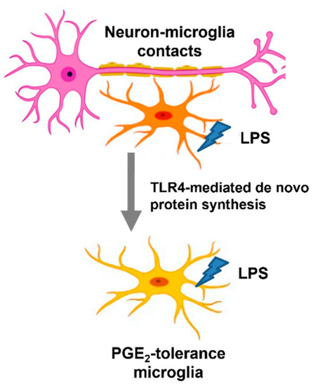 Toll-like receptors (TLRs) function as the prime cellular sensors in innate immune cells for microbial components. Thus, its activation must be properly controlled by various mechanisms to maintain homeostasis. For instance, the induction of endotoxin tolerance by TLR4-ligand lipopolysaccharide (LPS) is one mechanism to prevent overstimulation from continuous exposure to the same and related danger signals [49]. The activation of the LPS receptor complex induces TLR4 dimerization/oligomerization with rapid activation of the MyD88-dependent signaling and TRIF-dependent signaling pathway, and further triggers various transcription factors, leading to strong production of pro-inflammatory cytokines [50]. Additionally, the activity of the microRNA miR-146a—known to target key elements of the myeloid differentiation factor 88 (MyD88) signaling pathway—including IL-1 receptor-associated kinase (IRAK1), IRAK2, and tumor necrosis factor (TNF) receptor-associated factor 6 (TRAF6), has been reported to establish and sustain tolerance [51]. Our data revealed that TLR4 activation and de novo protein synthesis are required for developing neuron govern PGE2 tolerance in microglia during ET (Figure 4). It is important to further study the mechanisms underlying neurons that modulate microglial TLR4 activation, its downstream signaling pathways, and de novo protein synthesis to preserve PGE2 tolerance.