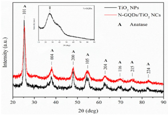 X-ray diffractograms synthesized TiO2 NPs and N-GQDs/TiO2 NCs. The inset shows the X-ray diffractograms of N-GQDs.
