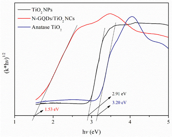The calculated bandgap curves of TiO2 NPs and N-GQDs/TiO2 NCs are shown in Figure 2. The spectrum of anatase TiO2 is also shown for better comparison. The bandgaps were obtained based on the Kubelka-Munk rule by plotting (khv)1/2 versus photon energy (hv). Based on the results obtained, it was found that all N-GQDs incorporated into TiO2 recorded lower bandgap energies than that of synthesized TiO2 (2.91 eV) and commercial pure anatase TiO2 (3.20 eV). The reduction in the bandgap of the as-synthesized TiO2 NPs is attributed to surface defects due to the presence of surface oxygen vacancies and Ti3+ self-doping, which was further confirmed by XPS analysis in Section 3.3. Moreover, the bandgap value of TiO2 NPs reflects that it can be activated upon the visible light source. Besides, as no Ti3+ environment was found in the Ti 2p spectra of the nanocomposite (Section 3.3), therefore the significant blue-shift in the bandgap energy of the N-GQDs/TiO2 NCs is attributed to the existence of Ti-O-C bonding between N-GQDs and TiO2 [41,42]. This interaction facilitates an efficient interfacial charge transfer process between TiO2 and N-GQDs. This phenomenon further ensures the prolonged lifetime of the excited states due to the improved charge separation in the nanocomposites. This observation implies that the introduction of N-GQDs onto the surface of TiO2 has shifted the optical bandgap, which enables the nanocomposite to generate e−/h+ pairs even though they have been irradiated with longer, non-toxic NIR light.