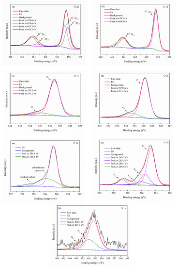 Meanwhile, the C 1s spectra of TiO2 NPs and N-GQDs/TiO2 NCs (Figure 3e,f) were deconvoluted and fitted with two and four peaks, respectively. A strong peak at 284.6 eV and a shoulder peak at 285.6 eV in TiO2 NPs are attributed to the adventitious carbon of the carbon tape attached to the sample holder and residual carbon that was associated with the carbon residues from the TTIP precursor, respectively [43,49]. Furthermore, the peak at 284.7 eV in N-GQDs/TiO2 NCs was assigned to sp2 hybridized carbon atoms (C=C) in the honeycomb lattice structure of N-GQDs.
