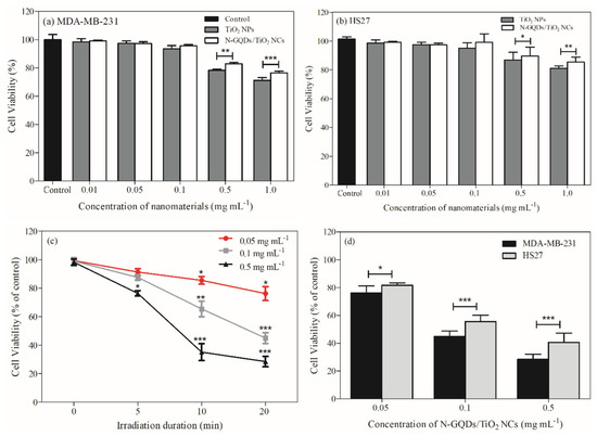 Cell viability of (a) MDA-MB-231 and (b) HS27 cells, (c) MDA-MB-231 cells treated with different concentrations of N-GQDs/TiO2 NCs (0.05–0.5 mg mL−1), then irradiated with various doses of NIR light (5–20 min) and (d) MDA-MB-231 and HS27 cells treated with different concentrations of N-GQDs/TiO2 NCs (0.05–0.5 mg mL−1), then irradiated with NIR light for 20 min. The cell viability was estimated at 24 h after irradiation. Data are presented as the mean ± SD of two independent experiments made in three replicates (n = 6). Significant difference was tested using one and two-way ANOVA followed by the Tukey’s (a,b,d) and Bonferroni post-hoc tests (c), respectively * (p < 0.05), ** (p < 0.01) and *** (p < 0.001).