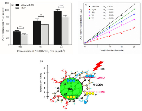 (a) ROS levels of MDA-MB-231 and HS27 cells were treated with different concentrations of N-GQDs/TiO2 NCs (0.05–0.5 mg mL−1) and were irradiated with NIR light for 20 min. Data are presented as the mean ± SD of two independent experiments made in three replicates (n = 6) and normalized to control. Significant difference was tested using a two-way ANOVA followed by a Bonferroni post-hoc test and compared to MDA-MB-231, ** (p < 0.01) and *** (p < 0.001), (b) Comparison of photo-induced ROS generated by N-GQDs/TiO2 NCs under irradiation of NIR light as a function of irradiation time and (c) A proposed possible mechanism of ROS generation by N-GQDs/TiO2 NCs upon NIR light irradiation.