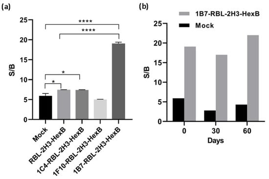 Activity of hexosaminidase released by transfected cells. (a) Signal-to-background ratio of mock transfectants, RBL-2H3 cells transfected with HexB and RBL-2H3-HexB clones. Means and SD of triplicates are plotted. (b) Stability of 1B7-RBL-2H3-HexB cells activity in the time. Representative data for one experiment are shown. * p < 0.1, **** p < 0.0001.