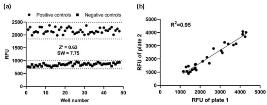 Assay performance. (a) Z’ factor and signal window (SW) determination. At the fully optimized assay, 48 replicates of positive and negative controls were studied. Dotted lines indicate mean ± 3SD of 48 data points. (b) Reproducibility. The same concentration of CCL20 was added to corresponding wells of two plates. Reproducibility of data from duplicates plates was investigated with a linear regression analysis. RFU: relative fluorescence units.