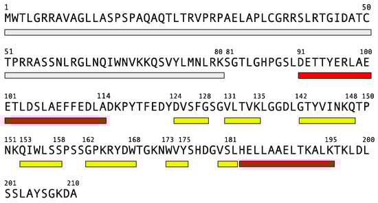 Human frataxin sequence and secondary structure, as reported for PDB 1EKG. Rectangles report the mitochondrial targeting signal and a spacer (gray), α-helices (red) and β-strands (yellow).